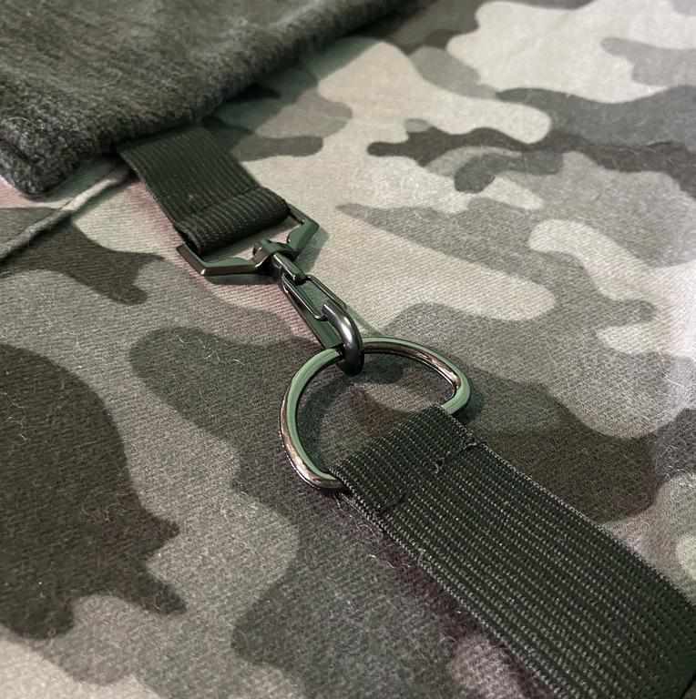 - Strap with swivel-clasp 1.5 inches long / 1 inch wide (attached at back corner)